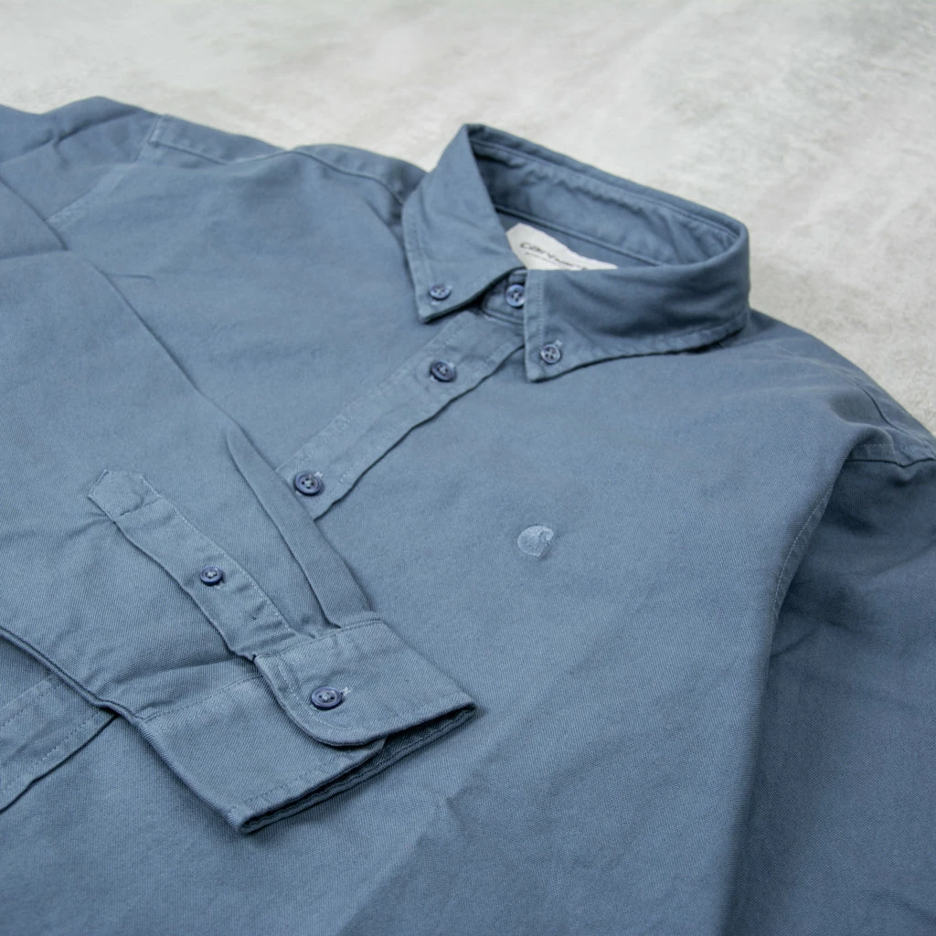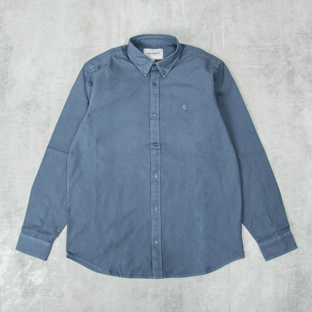 Carhartt WIP Bolton L/S Shirt – a classic button-down style and has been woven from Oxford cotton in a regular fit, and features a curved hem. It has been garment-dyed resulting in a subtle variation in color throughout and a softer feel. It is finished with a button-down collar and subtle embroidered Carhartt WIP ‘C’ Logo at the chest.