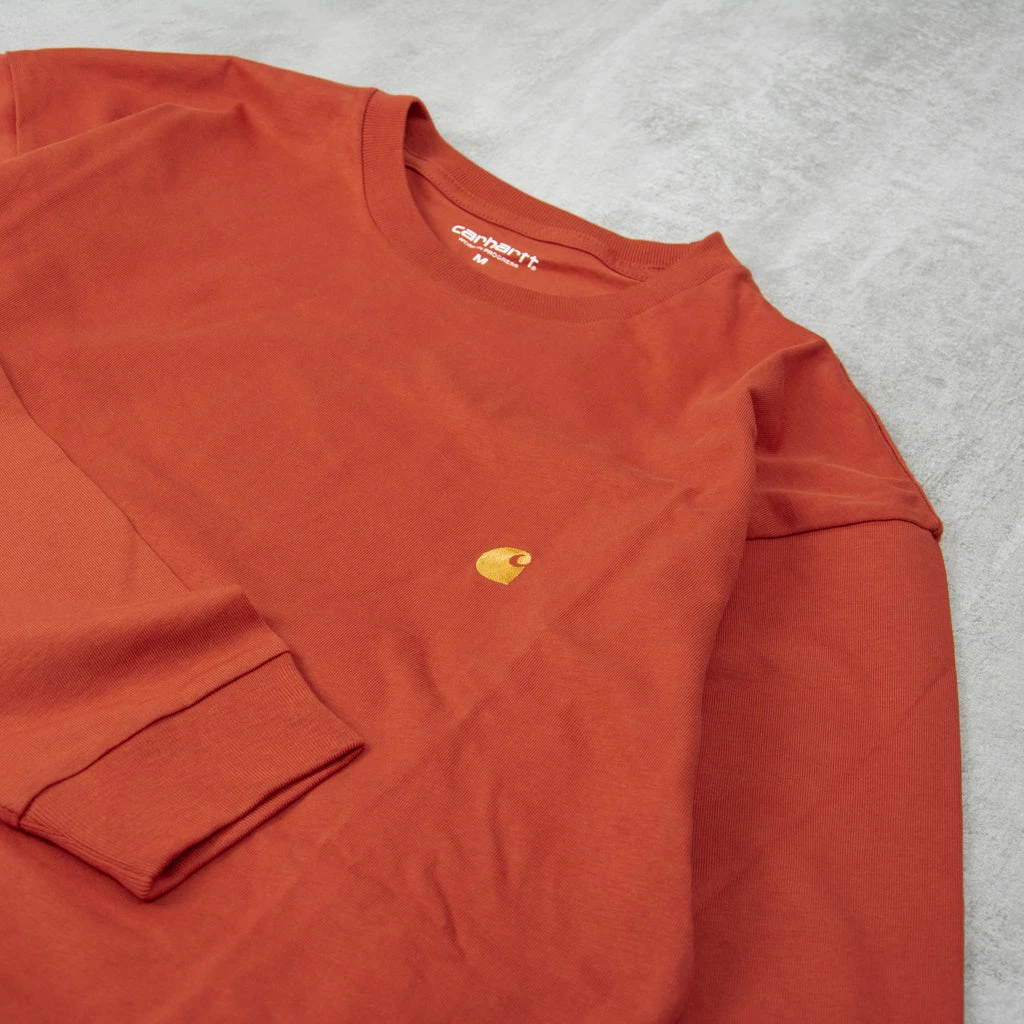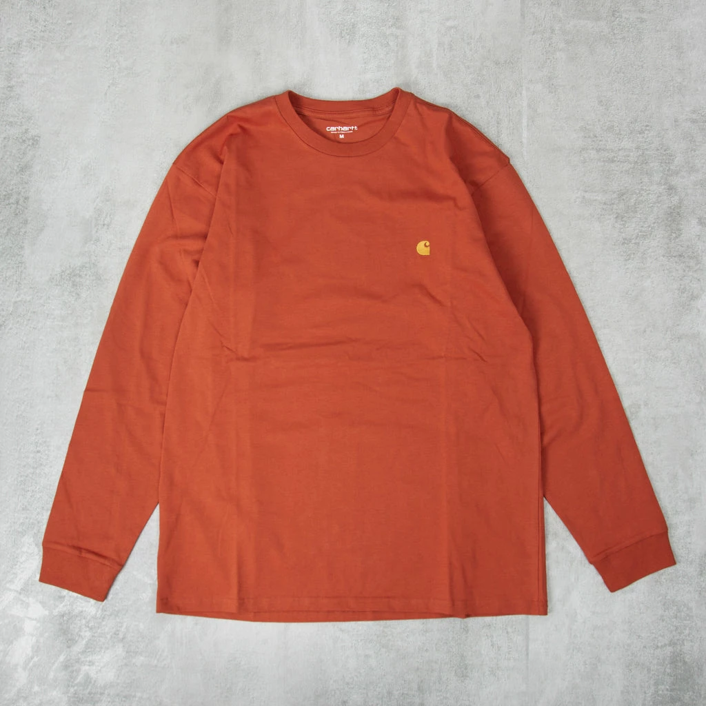 The Carhartt L/S Chase T Shirt is a plain T Shirt with minimal branding. It features a small golden Carhartt embroidered C to the chest. It is constructed in 100% Cotton.