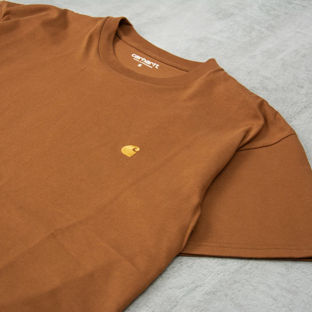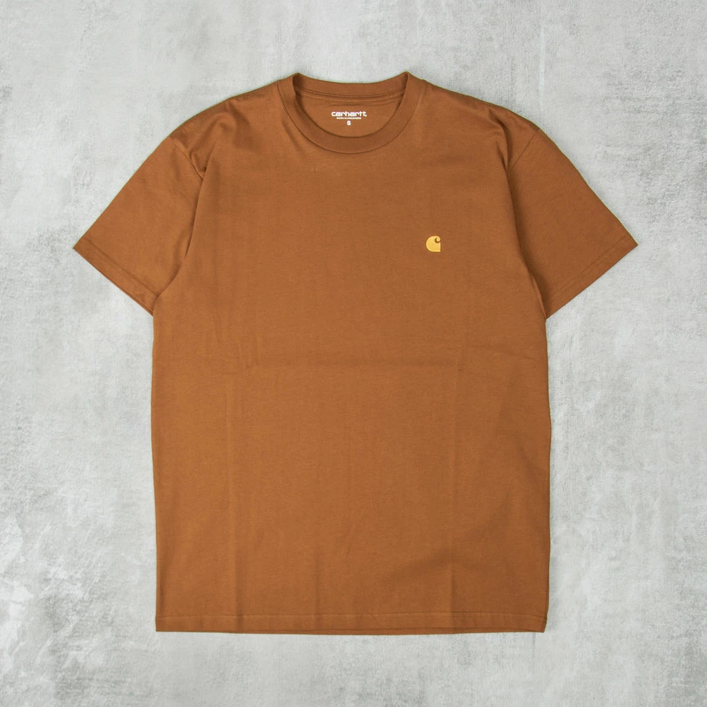 The Carhartt S/S Chase Tee is a plain T Shirt with minimal branding. It features a small golden Carhartt embroidered C to the chest. It is constructed in 100% Cotton.