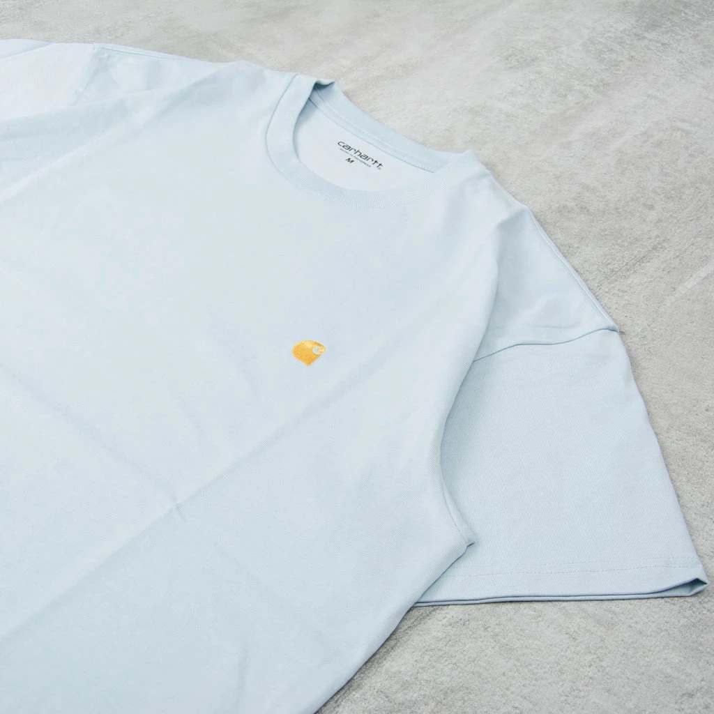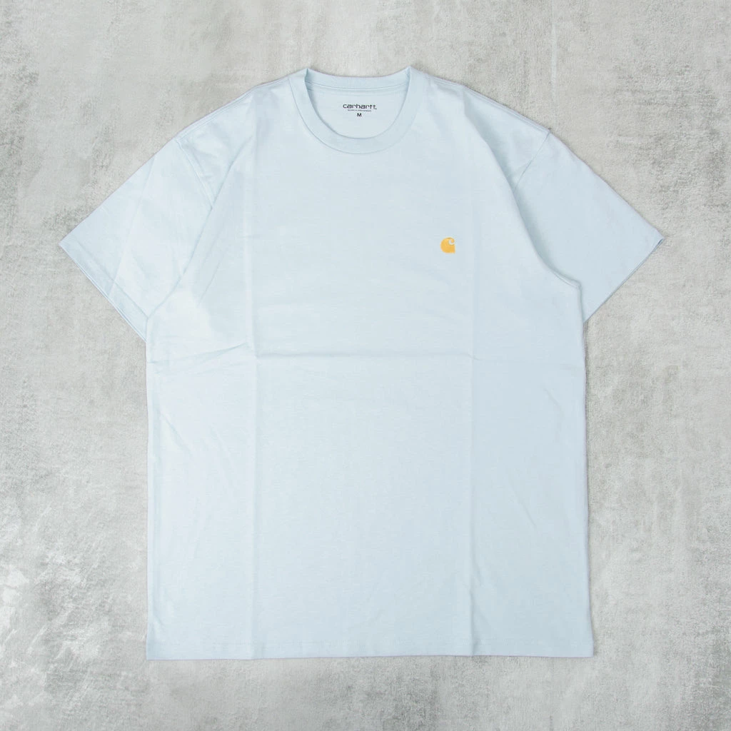 The Carhartt S/S Chase T Shirt is a plain T Shirt with minimal branding. It features a small golden Carhartt embroidered C to the chest. It is constructed in 100% Cotton.