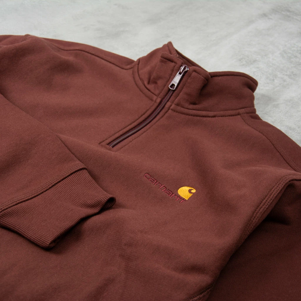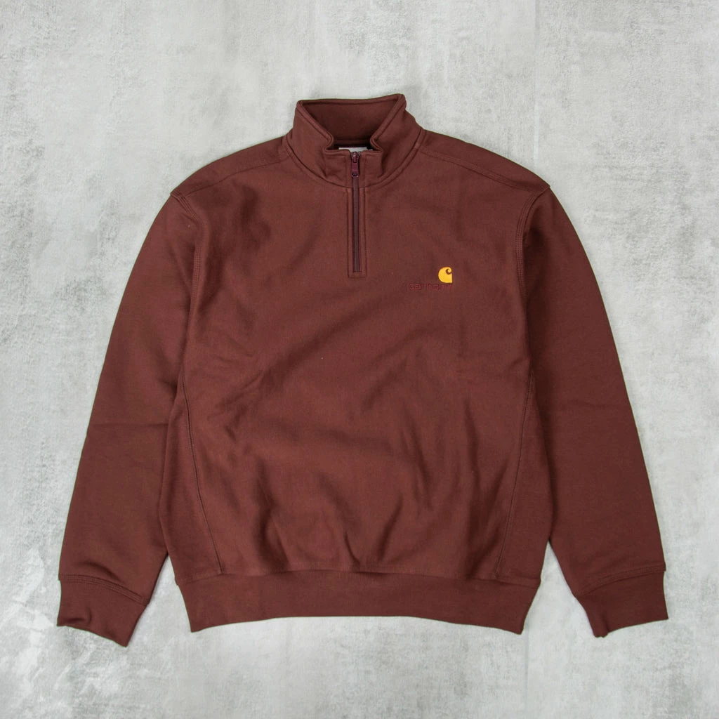 The Carhartt WIP Half Zip American Script Sweat in Natural is a poly cotton blended sweat in a loose, box fit. This versatile garment is finished with a half zipper and American Script embroidery to the chest.