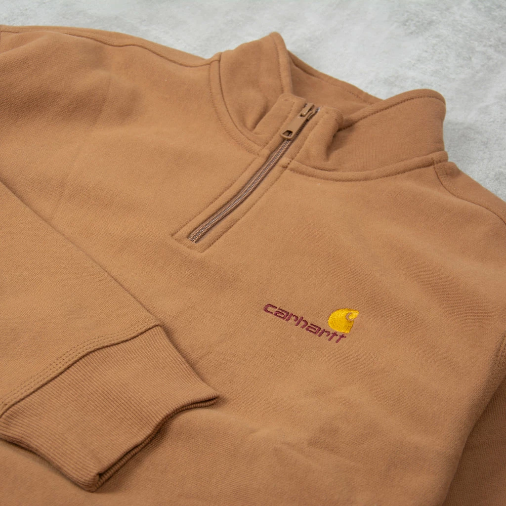 The Carhartt WIP Half Zip American Script Sweat in Natural is a poly cotton blended sweat in a loose, box fit. This versatile garment is finished with a half zipper and American Script embroidery to the chest.