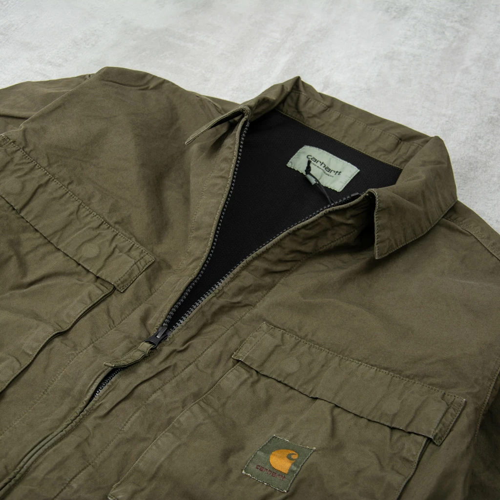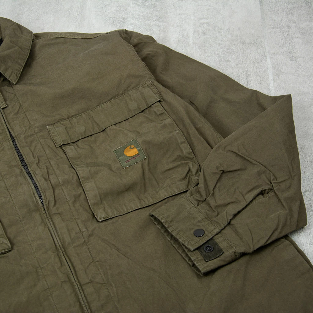 Carhartt WIP Kenard Shirt in Cypress is constructed from a lightweight cotton poplin that has been garment dyed for a more complex colour configuration. Lined inside with a breathable mesh, detailed with two chest and side pockets on the outside. A two-way zip closure and woven Square label. Loose fit.