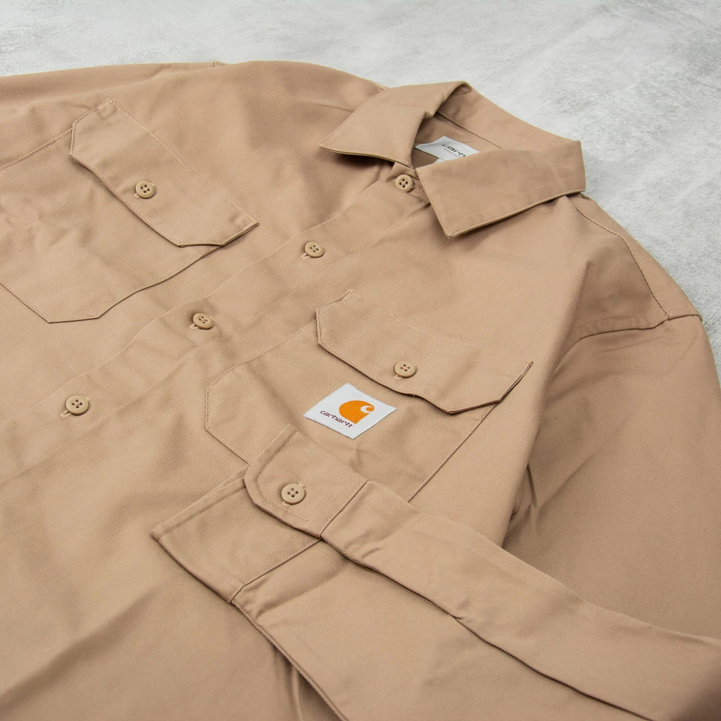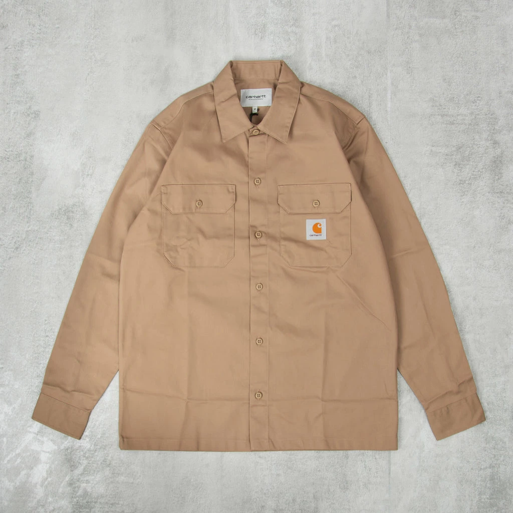 The Carhartt Master L/S Shirt is a regular fitting shirt. Featuring two chest pockets, a flag label and a WIP script label on the lower placket, made from 65% Polyester 35% Cotton – a classic workwear style that works on its own or layered up with a tee