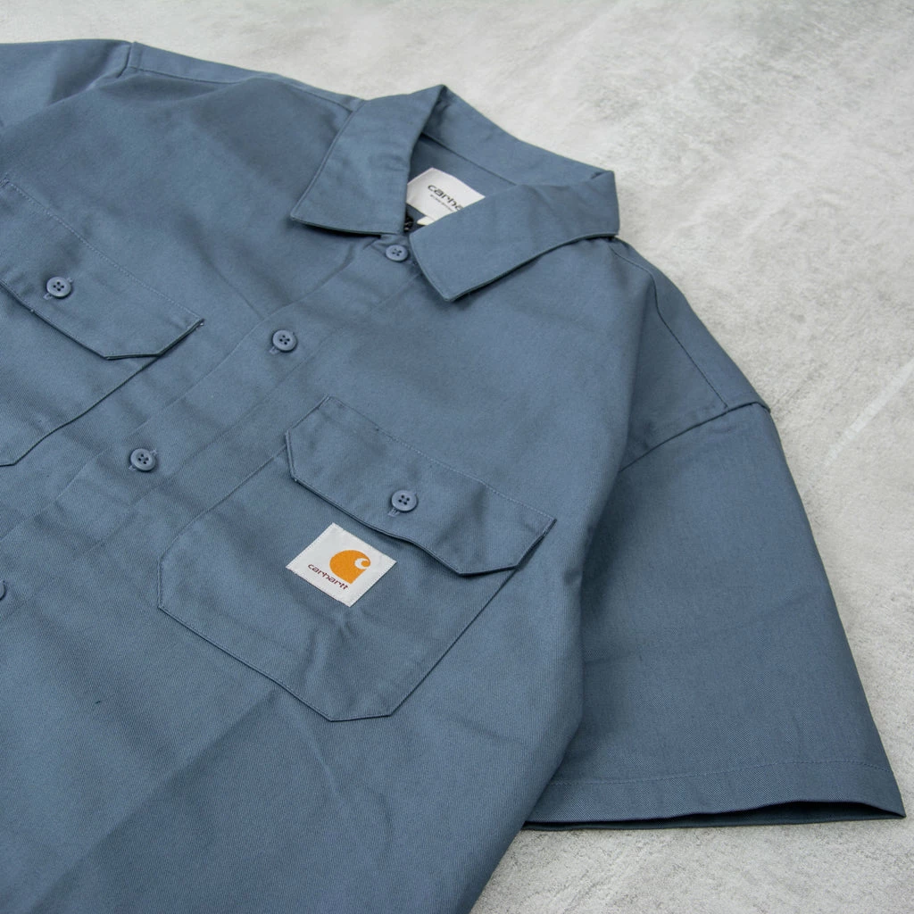 The Carhartt Master S/S Shirt is a regular fitting shirt. Featuring two chest pockets, a flag label and a WIP script label on the lower placket, made from 65% Polyester 35% Cotton – a classic workwear style that works on its own or layered up with a tee