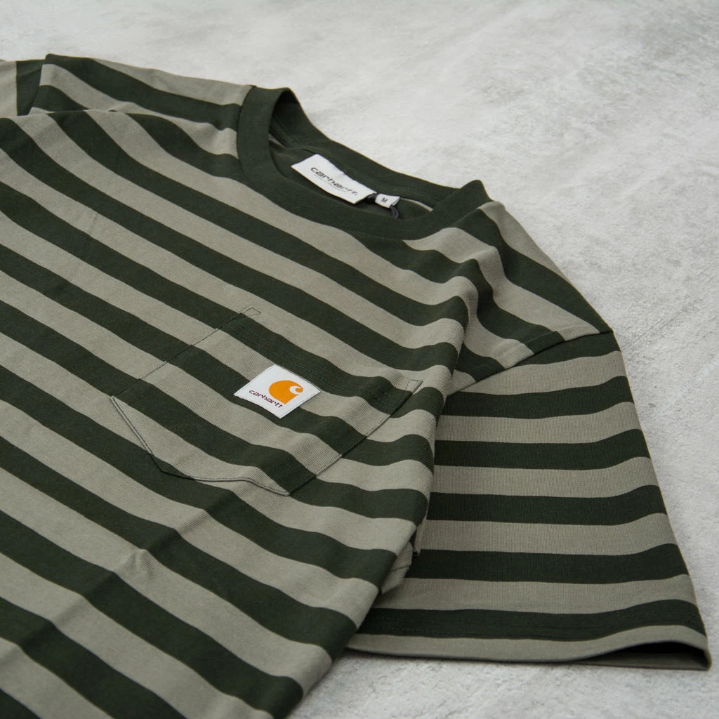 The Carhartt WIP Merrick S/S Striped Pocket Tee in Dark Cedar / Thyme is a midweight regular fit jersey that is yarn-dyed for a deeper longer lasting colour.