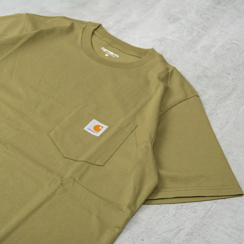 The Carhartt WIP S/S Pocket Tee is a regular fitting T-shirt made from 100% Cotton Single Jersey, 175 g/sqm. It features a front chest pocket with a classic branded label.