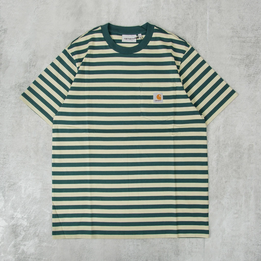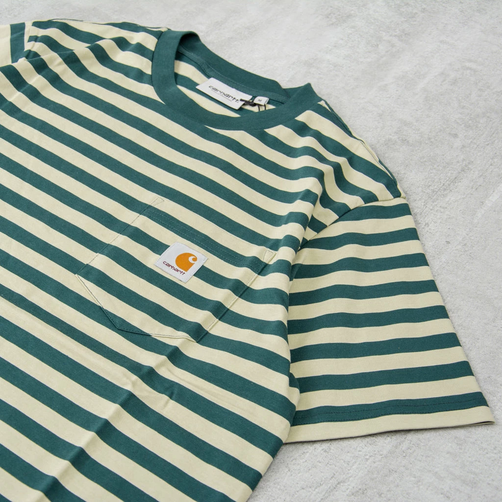 The Carhartt WIP Scotty S/S Striped Tee, constructed from 100% cotton and featuring a woven label on the chest pocket.