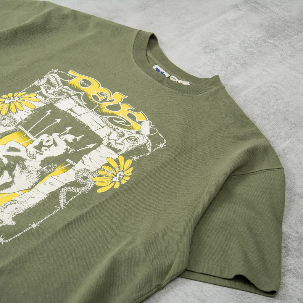 Deus ex Machina Embrace Tee in Clover – This enzyme stone-washed Deus ex Machina Embrace Tee offers a box-fit with an oversized design and is presented in a Clover hue. It contains a graphic on both the front and back.