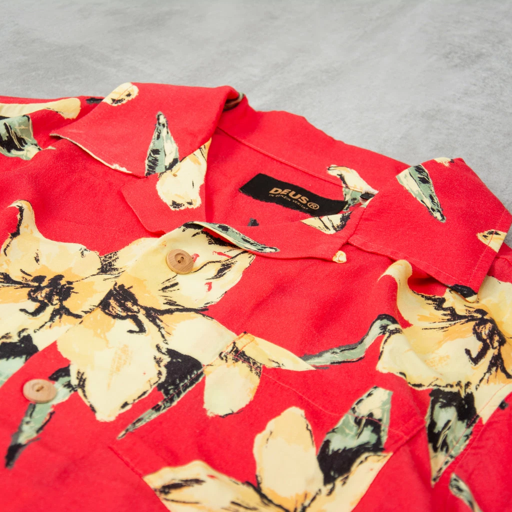 Deus Ex Machina Havana Shirt – Red taps in to a classic relax fit resort style shirt. Open collar, wooden buttons and an easy going rayon fabrication.