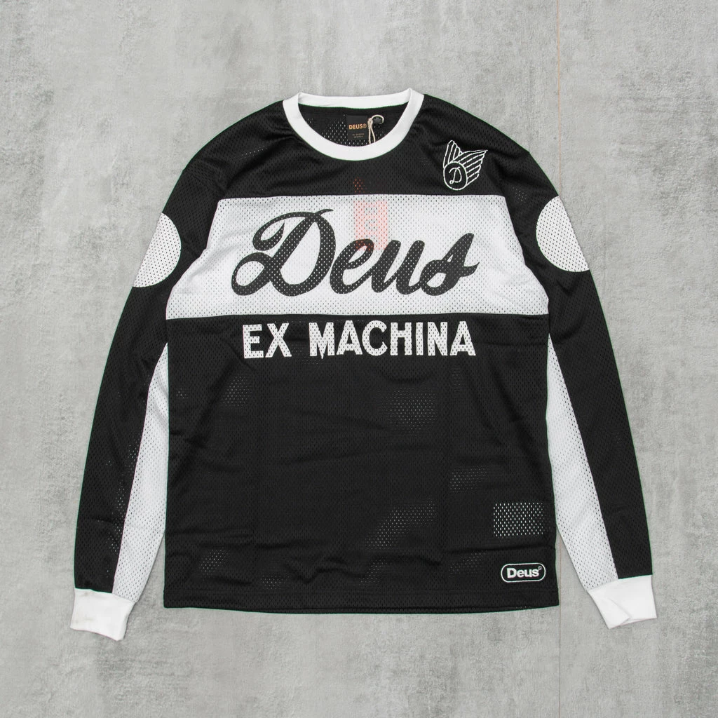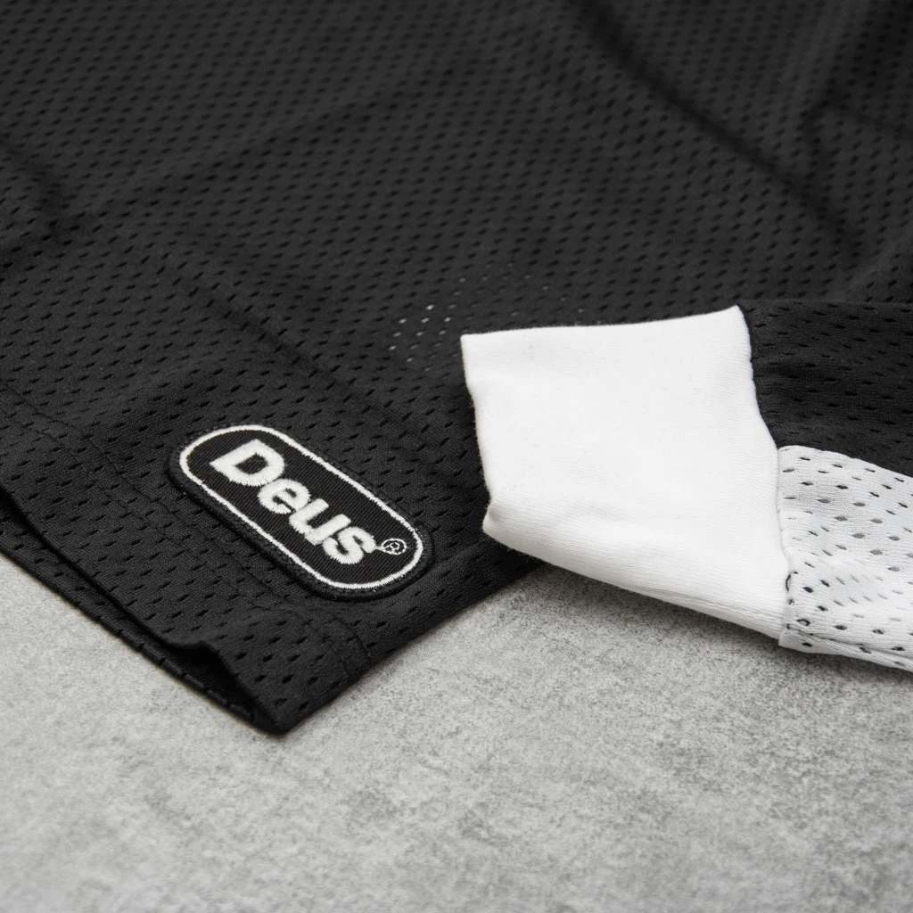 a regular fit multi panel long sleeve moto jersey made from 100% polyester mesh fabrication and Deus branding