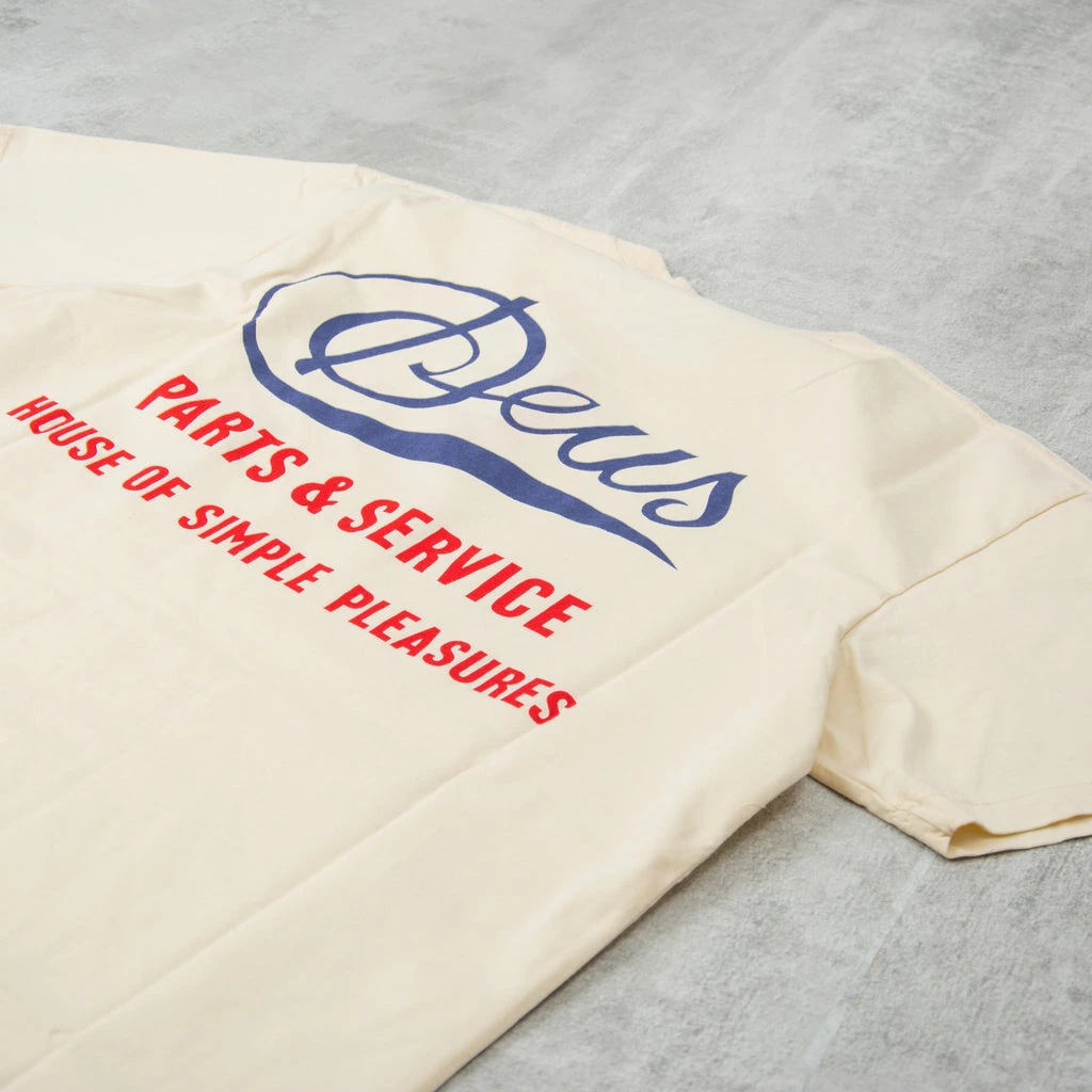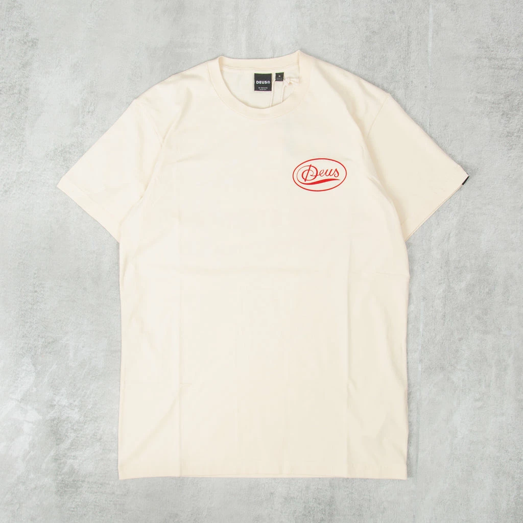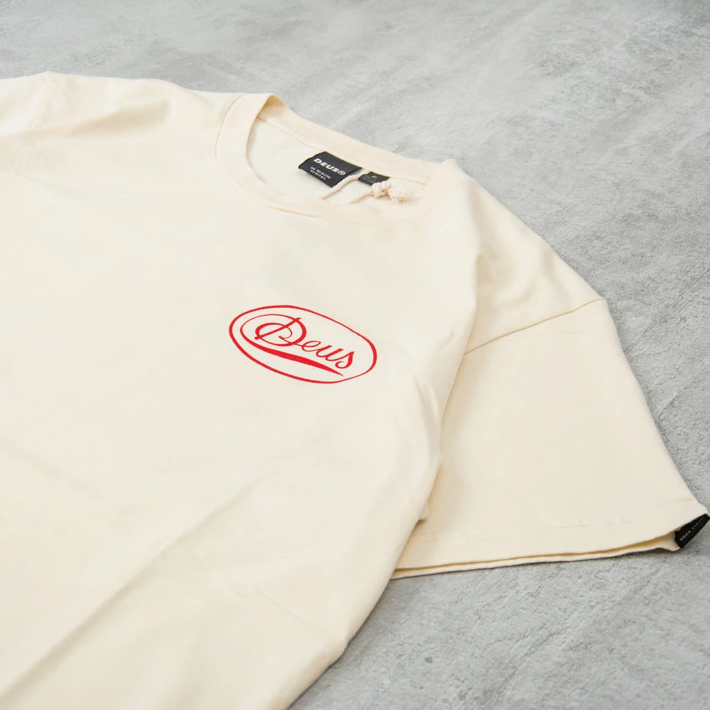The Deus ex Machina Sparks Tee in Dirty White offers a simple motor-centric print on a light weight creamy base.