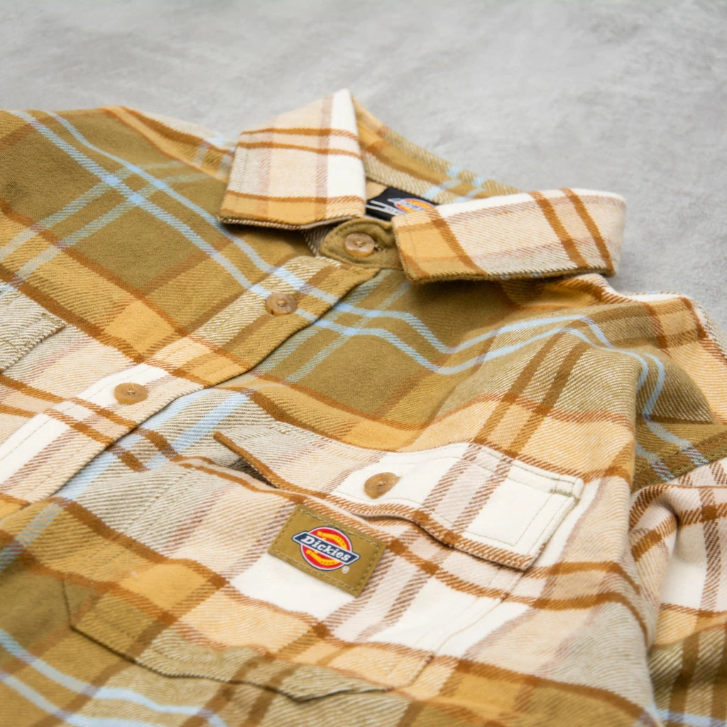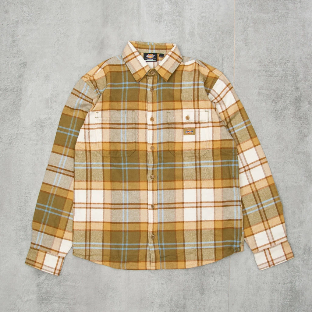 The Dickies Orting Shirt in Green Moss 100% cotton twill flannel check shirt in a regular fit. Featuring a brushed flannel cotton finish and two pocket finish.