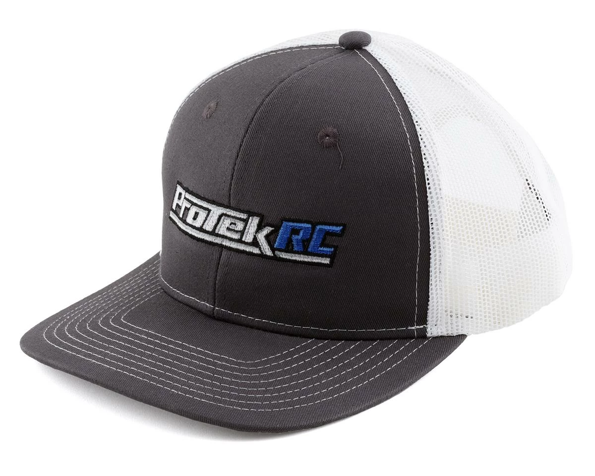 This is the ProTek R/C Grey Trucker Hat. This hat features the ProTek R/C logo embroidered into the front while the rear features a white plastic mesh material that will help keep your head cool in the heat of competition. There is also a plastic strap on the back of the hat providing βone size fits most’ adjustability.